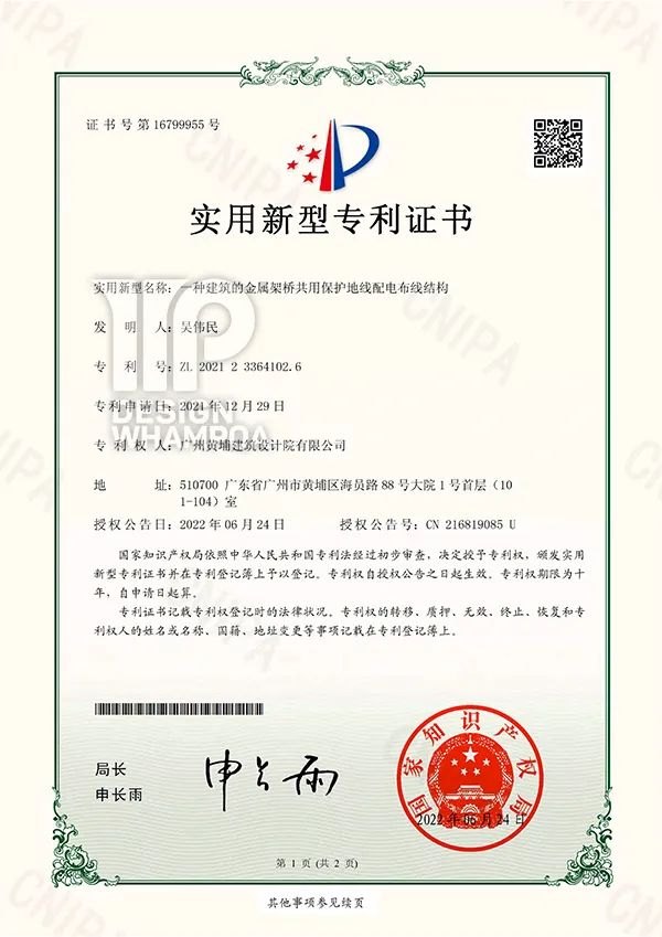 由廣州黃埔建筑設(shè)計院研發(fā)的《一種建筑的金屬架橋共用保護地線配電布線結(jié)構(gòu)》榮獲國家實用新型專利授權(quán)…