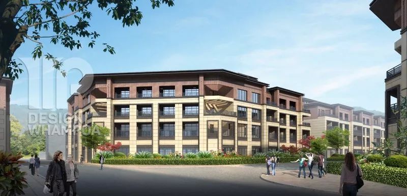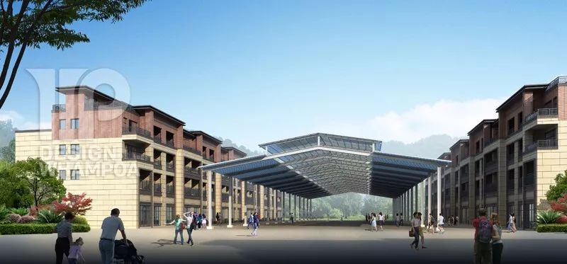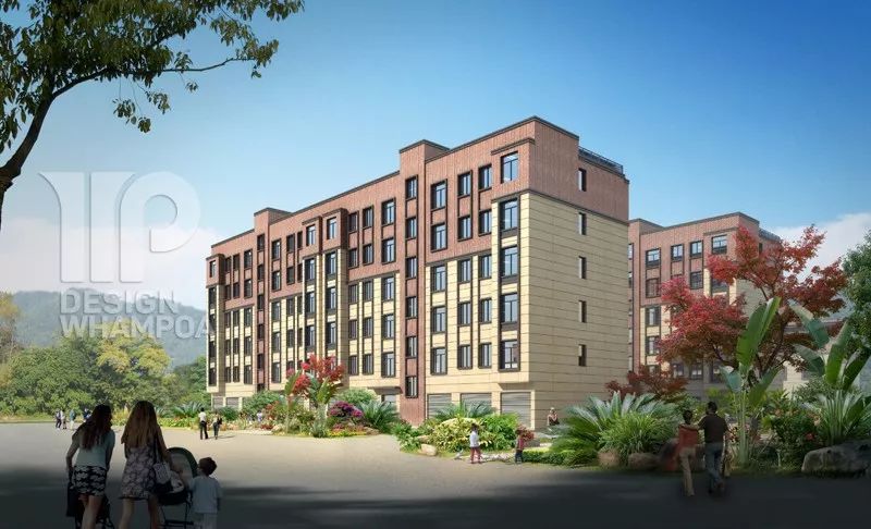 層層疊疊面磚與規(guī)整框架的組合無(wú)疑是最具代表性的現(xiàn)代城鎮(zhèn)建設(shè)風(fēng)格,立面材質(zhì)采用柔和色調(diào),主要分為下部分淺黃色仿石漆,頂層為咖啡色面磚,色彩間相互襯托呼應(yīng),也是對(duì)傳統(tǒng)建筑色彩元素的一種突破與創(chuàng)新。