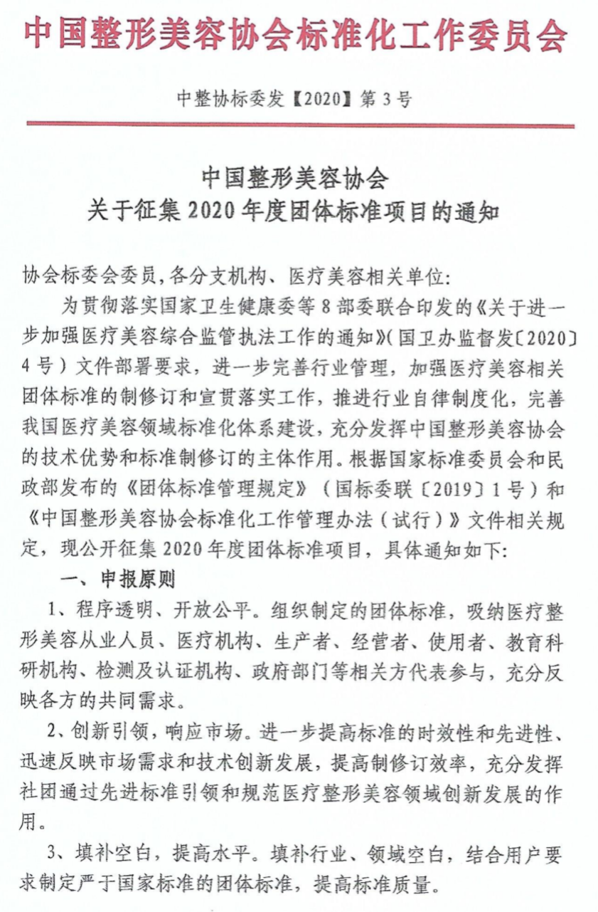 5月20日,中國整形美容協(xié)會下發(fā)了《關(guān)于征集2020年度團(tuán)體標(biāo)準(zhǔn)項(xiàng)目的通知》(以下簡稱《通知》)。