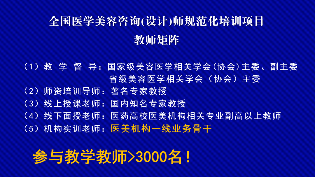 田亞華教授介紹說(shuō),醫(yī)學(xué)美容咨詢(設(shè)計(jì))職業(yè)技能規(guī)范化培訓(xùn)項(xiàng)目已經(jīng)在全國(guó)范圍啟動(dòng),而且已經(jīng)成為全國(guó)醫(yī)美行業(yè)服務(wù)技術(shù)人員規(guī)范化培訓(xùn)的一項(xiàng)重要工作。培訓(xùn)項(xiàng)目啟動(dòng)后,醫(yī)美機(jī)構(gòu)現(xiàn)場(chǎng)咨詢師、網(wǎng)電咨詢師、客服以及互聯(lián)網(wǎng)醫(yī)美平臺(tái)、醫(yī)美中介等人員均須接受規(guī)范培訓(xùn)。據(jù)介紹,培訓(xùn)項(xiàng)目的老師有3000多名,均由著名專家和經(jīng)驗(yàn)豐富的專業(yè)老師進(jìn)行授課;為了保證教學(xué)和培訓(xùn)質(zhì)量,經(jīng)過(guò)公開(kāi)征集、推薦,遴選產(chǎn)生了首批全國(guó)醫(yī)學(xué)美容咨詢(設(shè)計(jì))師職業(yè)技能規(guī)范化培訓(xùn)教學(xué)督導(dǎo)。