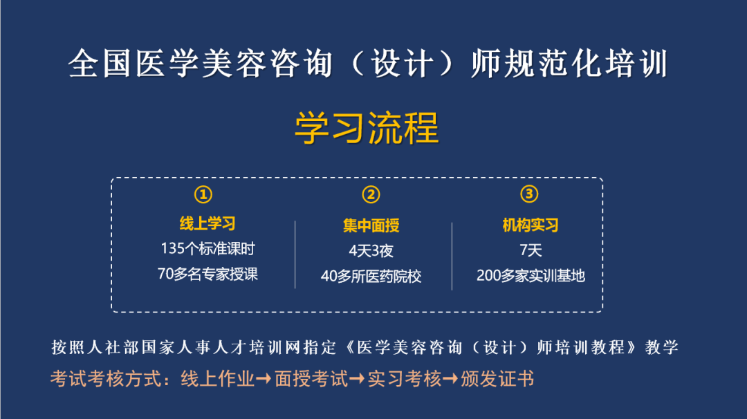 根據(jù)培訓(xùn)要求,學(xué)員培訓(xùn)考試考核合格后,將獲得人社部中國國家人事人才培訓(xùn)網(wǎng)頒發(fā)的“專業(yè)(職業(yè))技能培訓(xùn)合格證書”和中國整形美容協(xié)會教育培訓(xùn)中心頒發(fā)的“醫(yī)學(xué)美容咨詢(設(shè)計)師規(guī)范化培訓(xùn)合格證書”,該證書是醫(yī)學(xué)美容咨詢(設(shè)計)專業(yè)(職業(yè))相關(guān)人員參加國家專業(yè)(職業(yè))技能規(guī)范化培訓(xùn)的合格證明,也是國家職業(yè)技能等級認(rèn)定的依據(jù)。