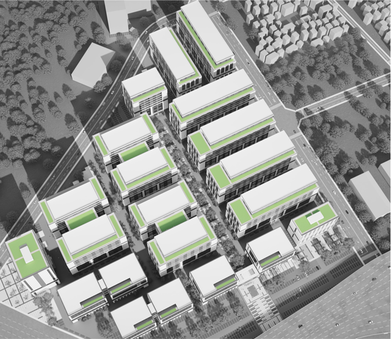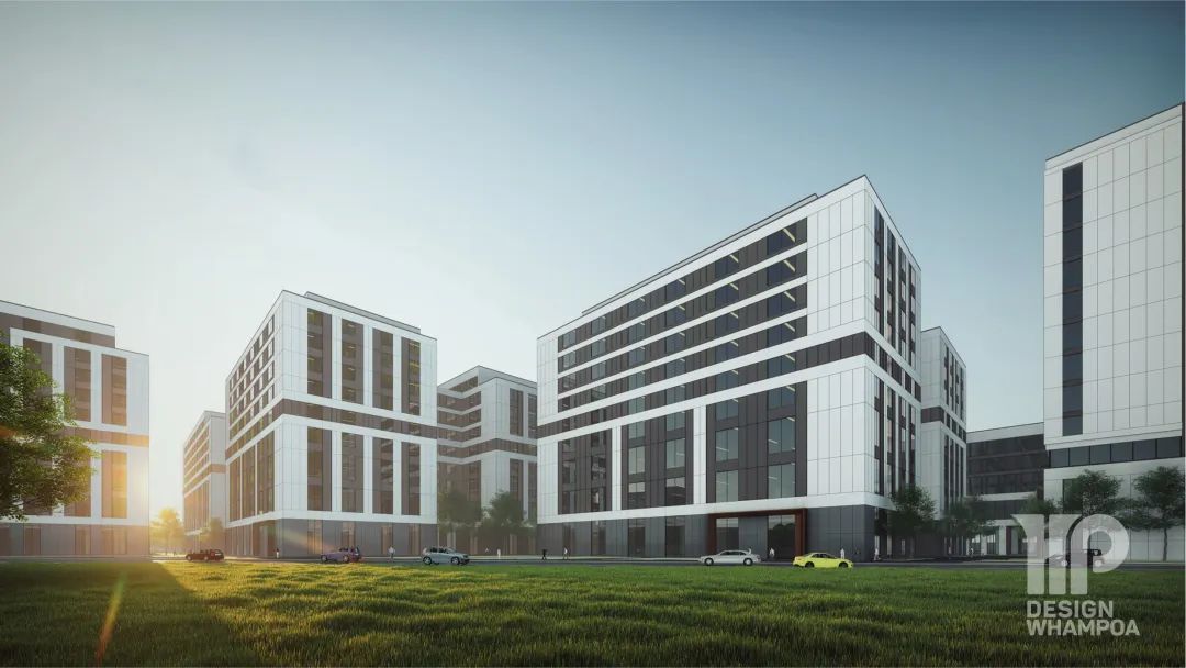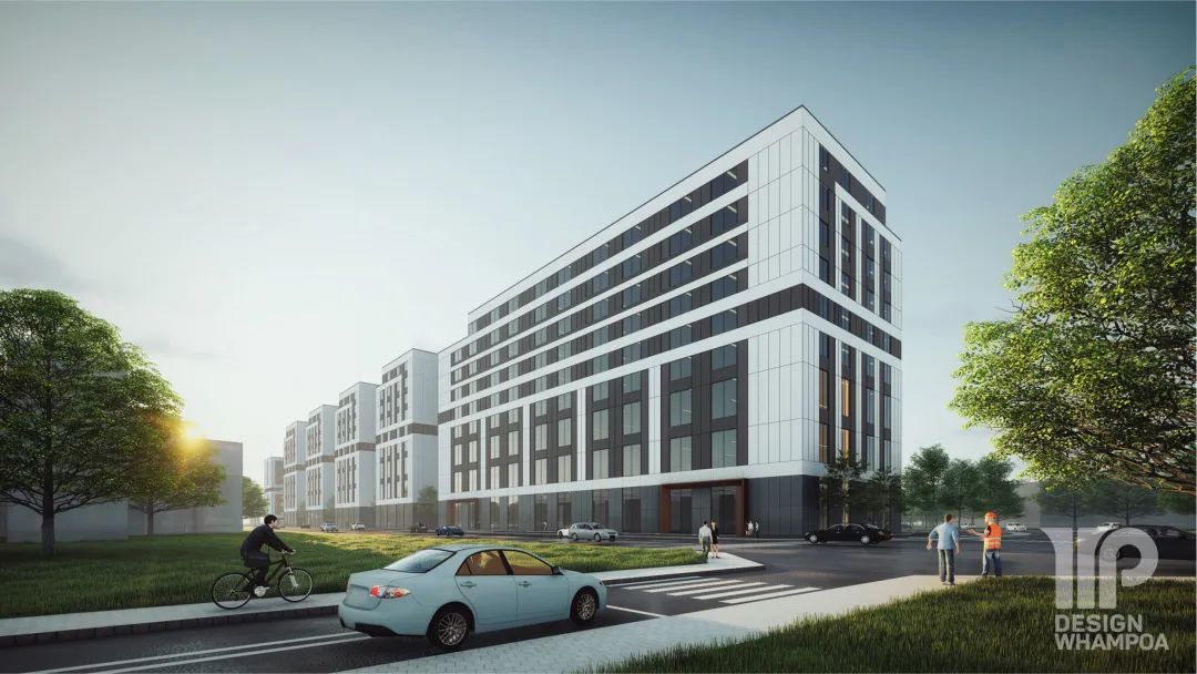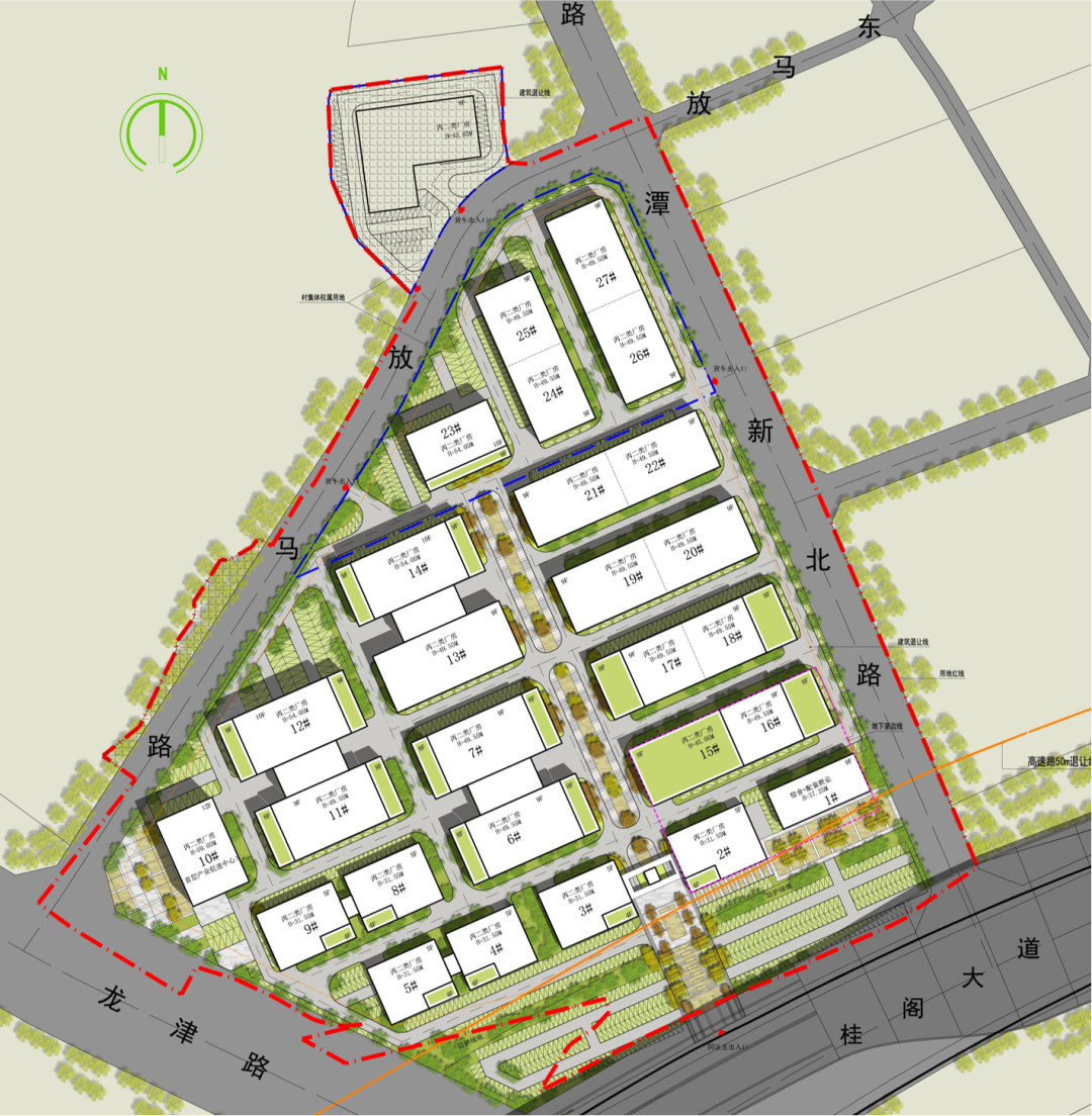 園區(qū)宿舍和餐飲配套布置于地塊東南角,緊鄰道路等級(jí)較高的桂閣大道,具備良好的展示面。產(chǎn)業(yè)促進(jìn)中心設(shè)置于地塊西南角主要規(guī)劃路交叉口,10# 首層,此樓三面開敞,集散及廣場(chǎng) 空間寬裕,景觀視野開敞,展示性強(qiáng)。